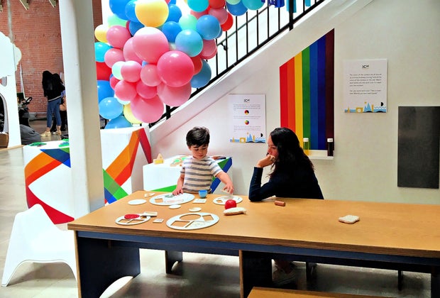 The huge open space has no dividing walls and blends sensorial play-based areas with interactive exhibits suitable for babies, toddlers, and kids up to eight years. Designed to spark wonder, SCCM’s current performing and visual arts installations invite children to experiment, explore, and create. There’s one dedicated to the magical world of LA's classic Bob Baker Marionette Theater: a few glass cases containing vintage puppets line the brick wall, but the real centerpieces are several marionettes of different shapes and sizes that young puppeteers can handle—including Rufus, a giant puppet connected to thick ropes which visitors can pull to make him move. Children have the opportunity to garnish three larger-than-life stackable birthday cakes with felt decorations and sweets, too. My son had a blast not only decorating, but rolling a tier of cake around the floor with some pint-sized partners in crime.