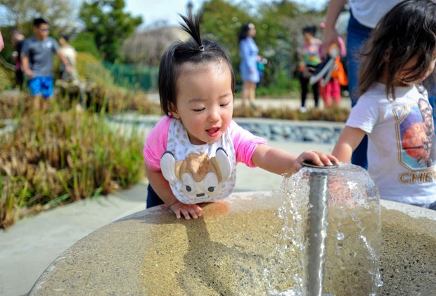 However, all of the above are just the prelude on a child’s visit to the Huntington; the main attraction is the Children’s Garden. As much a playground as a garden, this space gives kids the chance to discover the elements: light (“fire”), water, wind, and earth. No need to give kids direction; just set them loose and watch as they experiment and play. Young visitors can sculpt with magnetic sand (which feels like a powder but forms shapes when poured on a magnetic bar); run through tunnels, fountains, a fog grotto, and a misting “rainbow room;” go hands-on with assorted fountains and pools, and experiment with sound at the pebble chimes. Inspired by different structures, kids set up impromptu tea parties and create games to chase after each other. You’ll want to allot a minimum of an hour for your child to explore; my daughter often cannot be pulled away for any other reason than “the Huntington is closing and we’re going to be locked in.”
