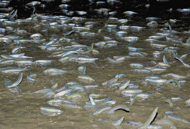 Anywhere from a dozen to a thousand fish may wriggle up the beach when the tide turns.