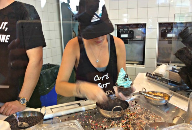 The small shop has risen to the moment, offering a wall for selfies and a photo booth; every cone is ready for its close-up. There is little doubt what brings people to Little Damage. The hour spent in the line that wraps around the corner and down 7th Street is time for posting on Snapchat, and not a cone gets scooped that isn't photographed before a single lick. Samples are brought through the line, which keeps things moving quickly at the counter and lets everyone try all four intriguing varieties.
