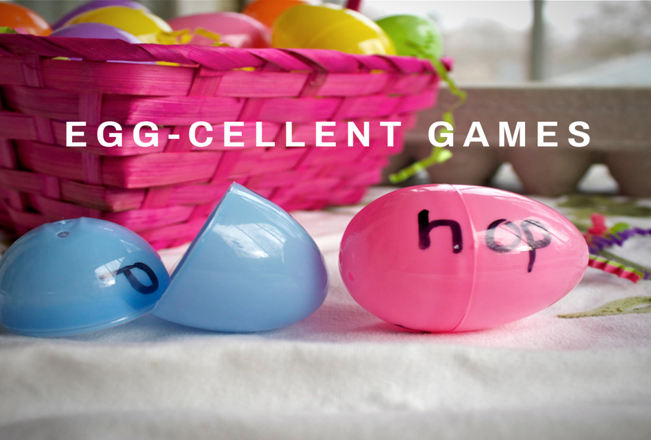 2. For a more advanced option: early readers can look for compound words by writing each half of the word on each half of the egg; see how many words you can create. Or, get some hands-on experience with word families by writing the endings on one half of the egg (e.g. "op"), and first letter choices on the other (e.g. "h", "p", or "m"). Twist the egg to create all the words in the family.