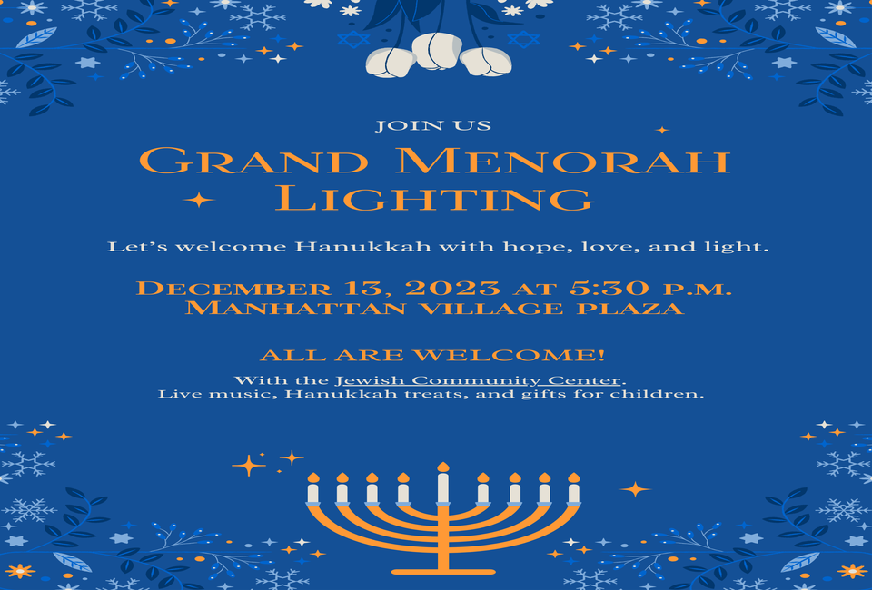 Manhattan Village celebrates Hanukkah. Festivities include music, games and activities, Hanukkah treats, and the lighting of the giant menorah.