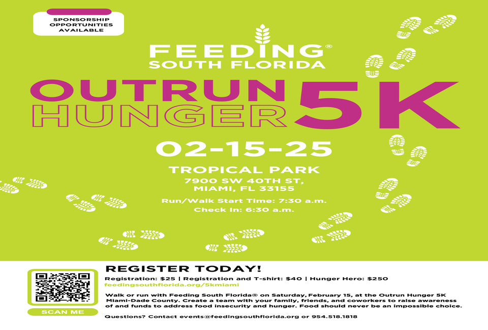 Feeding South Florida, the leading hunger-relief organization in South Florida, hosts its annual Outrun Hunger 5K Miami. Runners, walkers, families, and community leaders of all ages, including children, will come together at Tropical Park in Miami to raise funds and awareness of food insecurity in South Florida.