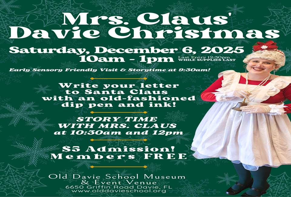 Mrs. Claus is coming to the Old Davie School. Kick off the holiday season with a magical, family-friendly experience everyone will love.