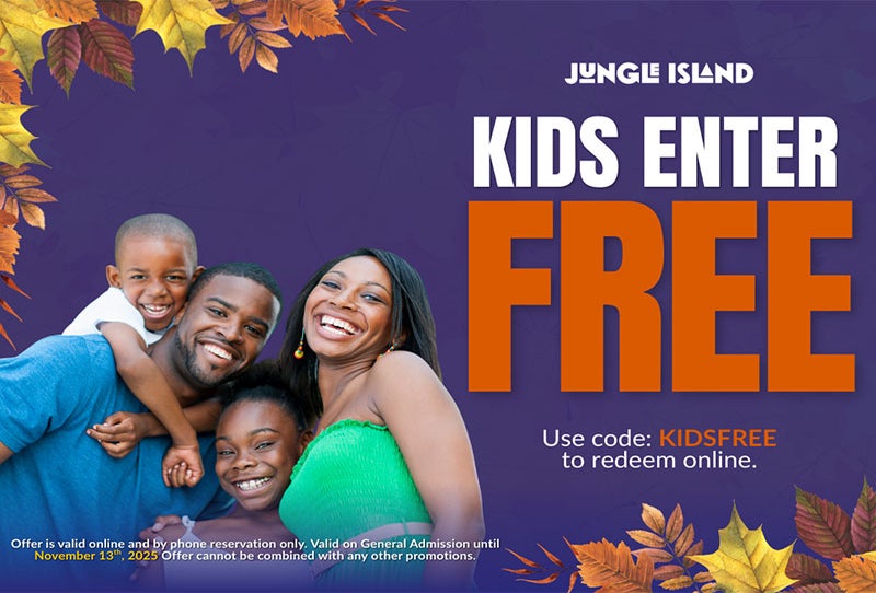 From now until November 13, children 9 and under receive FREE children's admission when booking online or over the phone. Use code, KIDSFREE online or call 305-400-7000 to redeem.