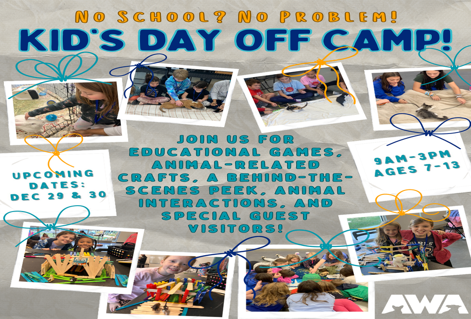 AWA hosts day camps on holidays and school breaks for children ages 7-13. The fun includes playing educational games, making animal-related crafts, hearing from special guests, taking a peek behind the scenes, and of course, hanging out with animals.