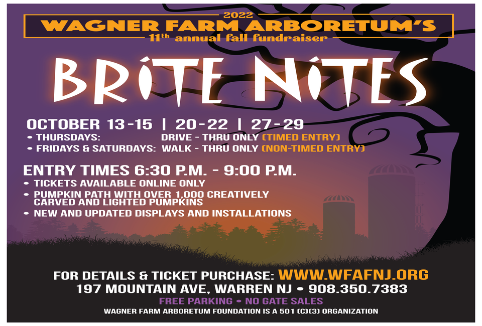 Wagner Farm Arboretum's popular Brite Nite attraction returns for its 11th season with both drive-thru and walk-thru options. The family-focused Halloween-themed Brite Nites showcases an elaborate display of intricate, creative, hand-carved, and lit pumpkins.