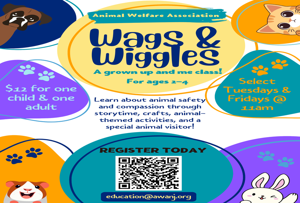 Wags & Wiggles is a grown-up-and-me style class for children ages 2-4. This program teaches the littlest animal lovers about animal safety, kindness and compassion.