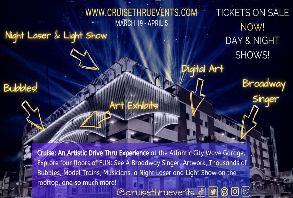 Cruise: An Artistic Drive-thru Experience features Broadway singers performing live, musicians, children's art installations, and many more surprises. Drive-thru thousands of bubbles, and dance in your seats at this musically entertaining event.