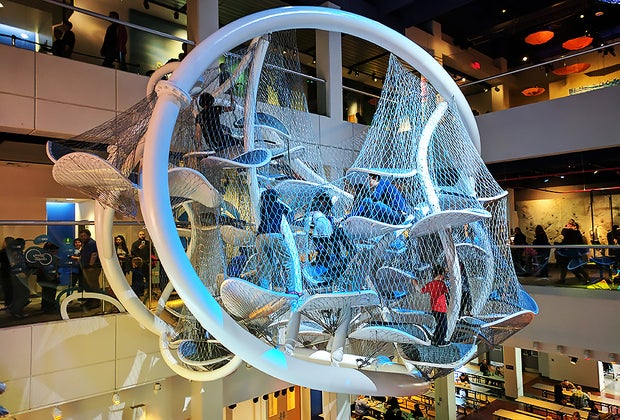 Test your balance and spatial awareness on the Infinity Climber at the Liberty Science Center. Photo by Mommy Poppins