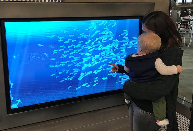 Before walking in, my friend held my son in front of the huge interactive fish tank so he could watch the fish and the bubbles float across the screen. The colors and the flutters of the little ocean creatures and flexible reef completely entranced him, and he immediately started to reach out to try to connect with his lifelike, finned friends. The screen had cameras above it, suggesting that there was a motion-activated feature. Had it been working (or perhaps simply turned on), my mini mister might have been able to coax the fish from one side of the screen to another with just a wave.