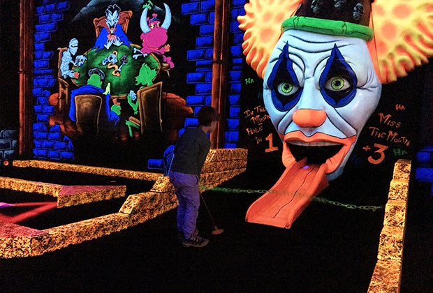 Step inside the black-lit space and watch your kids' eyes widen at the sight of fluorescent ghouls and skeletons haunting the 18-hole mini golf course. Designed as a cartoonish graveyard, the simple course features headstones and coffins as obstacles and an enormous, creepy clown face as the final hole. Golf balls glow in the dark so they are easy to spot on the dark turf, and day-glo painted curbs border each hole.