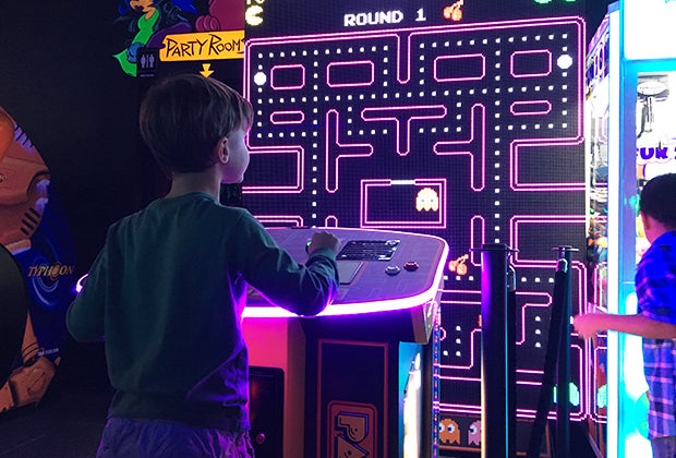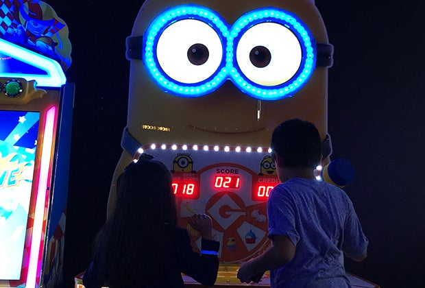 Younger kids may want to head straight for the arcade, where flashing lights and big-screen digital games beat anything they've played on your phone or iPad Mini. At the newly upgraded arcade in Fairfield, my son loved the wall-sized Pac-Man, Crossy Road, and Fruit Ninja games. He gleefully took up a yellow mallet to bop some Minions on the head in a new version of Whac-A-Mole. Classic race car and motorcycle course games were also a hit. Older gamers will love playing Typhoon and Jurassic Park, and tweens will beeline for the digital photo booth.