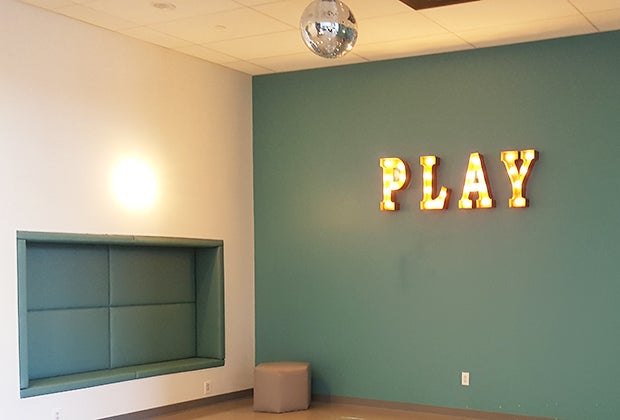 With its sleek modern design and cool color palette, Kidoolo has a decidedly chill vibe. Indeed, the gorgeous gray walls, low-to-the-floor ottomans, and silvery metallic poufs may remind you of trendy hotspots you frequented pre-kids. But here, instead of checking your ID and forking over a wad of cash for a night on the town, you fill out a waiver and pay a significantly smaller fee—$15 per child—for open play (adults get in free). High ceilings give the 5,500-square-foot space an industrial presence, but homey touches, like a rustic wood sign that greets guests with a friendly “hello," help to soften it. A bar area in the center of the floor allows adults to enjoy a sip of sparkling water or a small snack (prices range from $1-2) without taking their eyes off their kids.