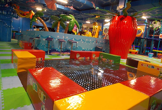 Step through an open shark mouth to enter the three-story gym that takes up the entire left side of the facility. It has all the favorites, from racing slides to trampolines and a fish climbing wall. The entire structure is padded and soft so kids can slide, bounce, and climb without hurting themselves. A replica of the giant floor piano from the movie Big invites tiny dancers to tickle the ivories with their socked feet. Interactive elements for the curious and energetic are sprinkled throughout the climbing structure, like the inviting ball pit that encourages kids to give it their best shot by pitching balls at the game screen.