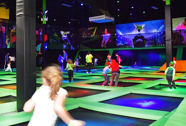 Launch’s ticket system is interesting. You’ll pay by the half-hour ($15 for 30 minutes, $20 for 60 minutes), and you'll get a color-coded wristband that enables you to jump at a specific time. Entries onto tramps happen every 15 minutes, and you can reserve a specific time slot in advance online. (Non-jumping chaperones are free, but they still need to sign in.)