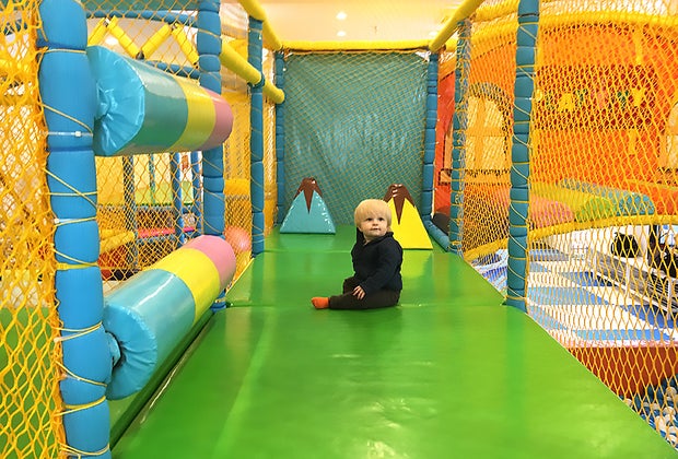 The final, rightmost section, was the perfect place to conclude our jungle gym jaunt. As if we were starring in our own version of Goldilocks and the Three Bears, my baby seemed to make himself right at home here. He could easily crawl around, climb up on the stacked rectangle, square, and triangle padded blocks, and slide down a slide that was his speed. He also LOL-ed a lot when we put him on the blue, green, and orange animal riders that little ones can romp around on if they’re tired of climbing. The hot air balloon, helicopter, and skyscraper decals on the wall are a whimsical touch that match the rest of the cityscape motifs.