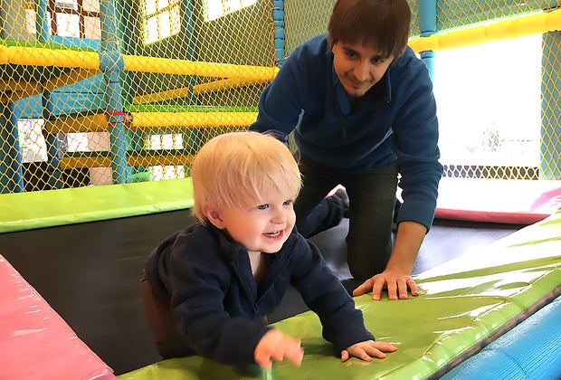 On his crawling tour, he could stop and amuse himself with spinning padded tubes, hanging punching bags, and netted tunnels—and he was tickled pink when we let him crawl (well, try to crawl) across the multi-colored bridge with "Play City" emblazoned above. He was ready and raring to go down the blue and yellow parallel slides, too, but I had trouble letting go—maybe next time. We can’t wait for the day he and his older cousin can race down the slides and dissolve into total OMGoshes and giggles when they reach the blue and white ball pit at the bottom. Before leaving this area, we also had to let him try his first trampoline. He can’t bounce by himself yet, but my husband did the honors so he could feel his tummy drop just a little bit. He was obsessed!
