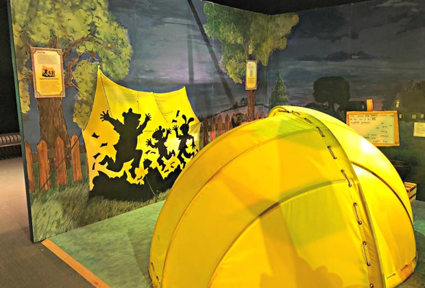 This was my son’s favorite part of the entire exhibit by far, and it was the simplest set up of them all — just some walls illustrated with renderings of Arthur and his friends camping in the backyard, and an actual giant yellow tent, outfitted with all the camping essentials. My son loved running around this display, but if you're visiting with a new walker, you may want to go into the tent to help your tot navigate the set-up inside.
