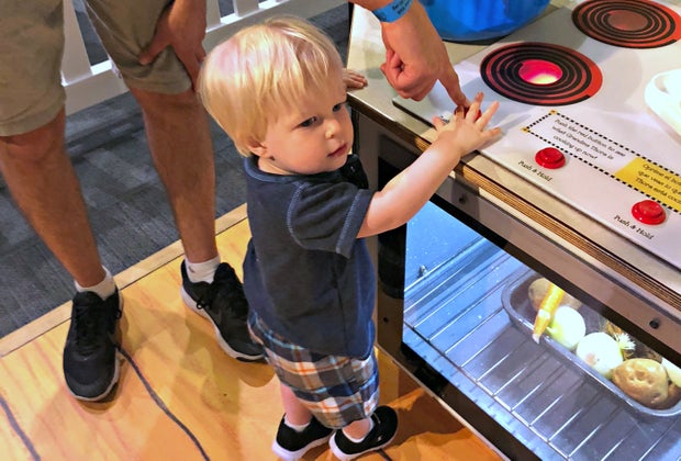 For older kids, there are word magnets in buckets at the campsite, for making up bedtime stories on magnetic boards. And for parents with munchkins who will be going on their first sleepover soon — or even to late sessions at sleepaway camp this summer — this portion of the exhibit definitely lends itself to conversations about how spending the night away from home for the first time can be worrisome. It's a perfect opportunity to assure kiddos that they’ll be safe, and that you're never more than a phone call away.