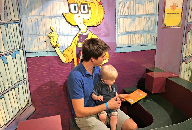Side note: my son was obsessed with the floor of this facade. He sat in the alphabet circle for a good 10 minutes, pointing to each of the letters, and running his fingers around each shape. If you have toddlers learning letters or shapes, this is a terrific place to let them test drive their new skills. And if you have several kiddos at home, it’s never too early to practice having everyone sit in a circle to listen to a story (patience is a virtue!). My husband also spent a while with our babe on his lap, waving books under the pretend scanner. Our little one loved the buzzy beeping sound it made each time his daddy swiped a book to be "checked out."