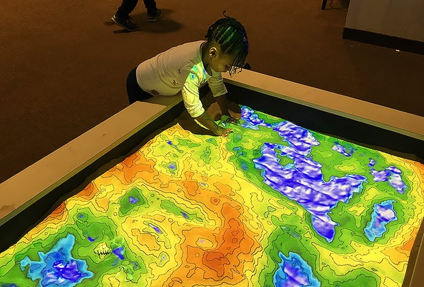 Just behind the pirate ship are three of the coolest new exhibits at the museum. First up, the electronic sand table features an image of the globe beamed onto the sand below, so kids squeezing and moving the sand will literally feel like they have the whole world in their hands.