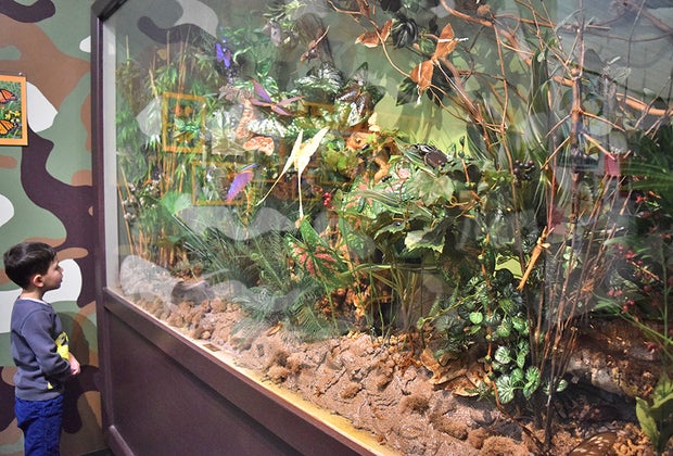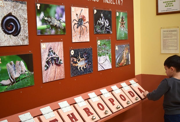 We bought our tickets ($10 for all guests over age 2) and started our adventure through Insectropolis. We followed the beautifully painted walls and wove our way through the themed rooms, which were packed with cases of insect specimens and interactive educational displays. Children can learn how to identify various insect classes, crawl through a "muddy" tunnel like a termite, test their bug knowledge on touch-screen computers, spot walking sticks in a scene of branches and bugs, or spin a wheel to learn about the life cycles of various insects.