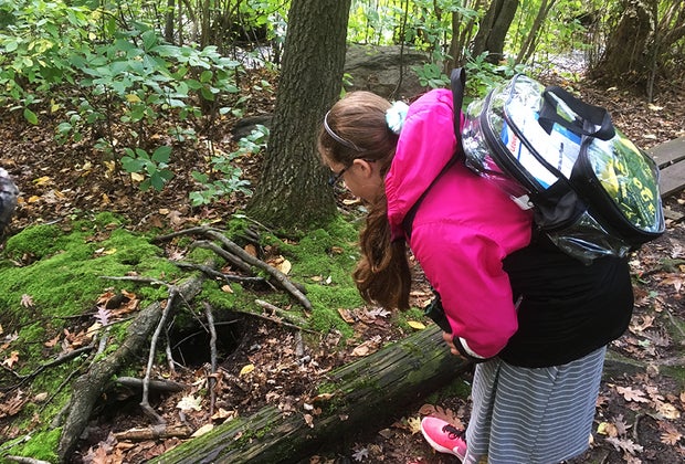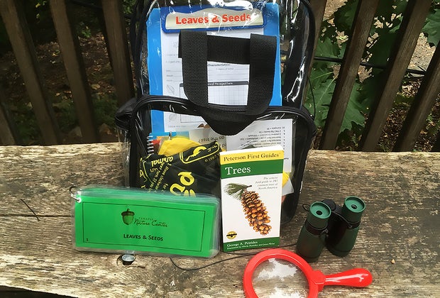 Pick up a backpack filled with supplies to help you investigate nature as you walk through the woods.