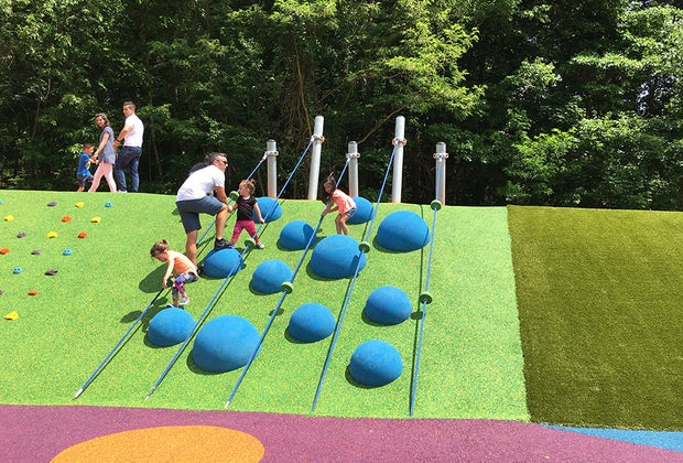 Cool hillside climbing equipment offers challenges for kids big and small.