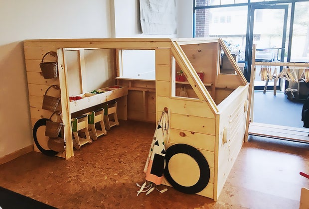 Inside Woodland, the 5-month-old to 5-year-old set can drop-in seven days a week for all sorts of imaginative fun. Kids can explore a variety of wooden toys and make-believe play areas, from a chicken coop and farmer’s market to a train and driving area. There’s a sandbox to dig into and a climbing slide to tackle.