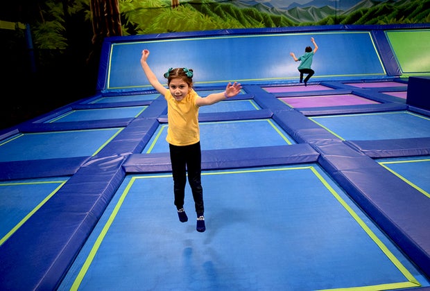 Challenge a friend on the bouncy dodgeball and basketball courts or hurdle over the padded bar that swings in a 360-circle. My kids got a kick out of the video game trampolines, where jumpers are projected into a video game and must jump to beat a series of stunts to advance to the next level. We could have stayed there all day!