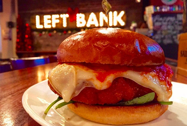 Breaded chicken & pork patty, mozzarella and marinara sauce burger at Left Bank.