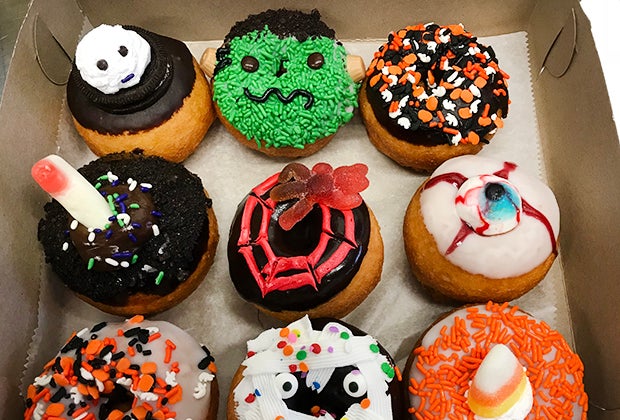 Forget the candy—Purple Glaze offers a sweet selection of Halloween-themed doughnuts.