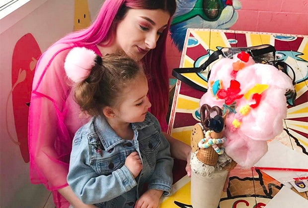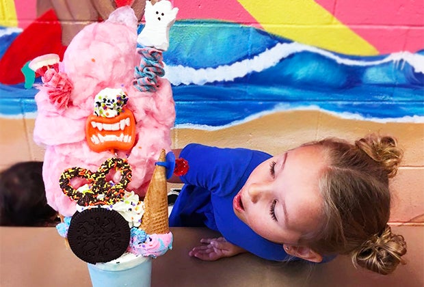 The best-selling Sideshow Shake starts with the ice cream flavor of your choice whipped up into a creamy milkshake. It’s topped with a waffle cone, ice cream cookie sandwich, fluffy swirls of cotton candy, a Ring Pop or rainbow lollipop, strips of sour candy, and finally, a chocolate-covered pretzel... whew!