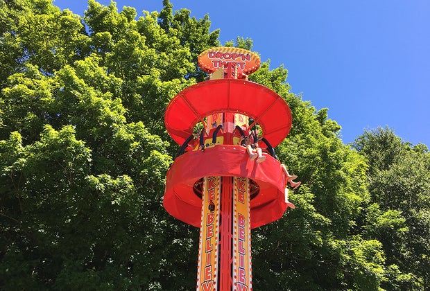 Land of Make Believe’s newest attraction, Scream Machine 360, sits smack-dab in the middle of the park. You can’t miss it: The giant pink and orange pendulum swings and lifts riders, all the while spinning seats upside down, offering a higher octane of fun for bigger thrill seekers and older kids.