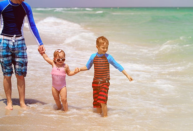 6. Beware of rip currents: Check your local forecast before setting out for the day and most importantly, teach children to recognize a rip current and how to handle getting caught in one. We wrote about rip currents before, noting that instead of trying to swim against the current, swimmers should swim parallel to the beach, out of the current, or just float until help arrives. While riptides are common near piers and jetties, rip currents occur elsewhere along the beach, too. Water might look foamy and brown, or a section might appear like a river, or a jumbled section amid the waves. “You cannot fight against the ocean,” says Lovelace. “It’s important to remember that rip currents aren’t half a mile wide. Sometimes you just need to swim 10 yards to the left or right to get out.” The most important thing, he notes, is not to panic: remind yourself, and teach your child, how to take deep relaxing breaths (puff your cheeks when exhaling) and stay in control and relaxed.