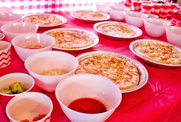 Pizza is our go-to Friday meal, so why not make an entire celebration in its honor. The recipe for this party starts with presetting your oven to 375 degrees. Suit up your guests with chef hats and mustaches. Hand out pizza crusts (we used the precooked kind) in individual pie pans and give each guest small containers of sauce, cheese, pepperoni, broccoli, and other toppings.
