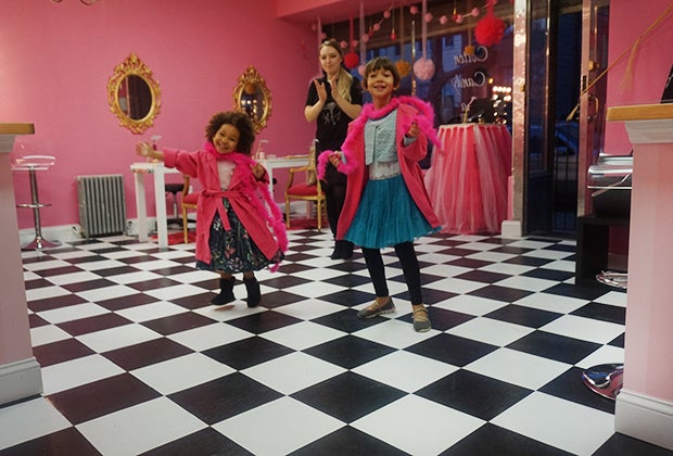 Birthday parties are the specialty here. Kids don pink robes and later pink boas for a dance party.