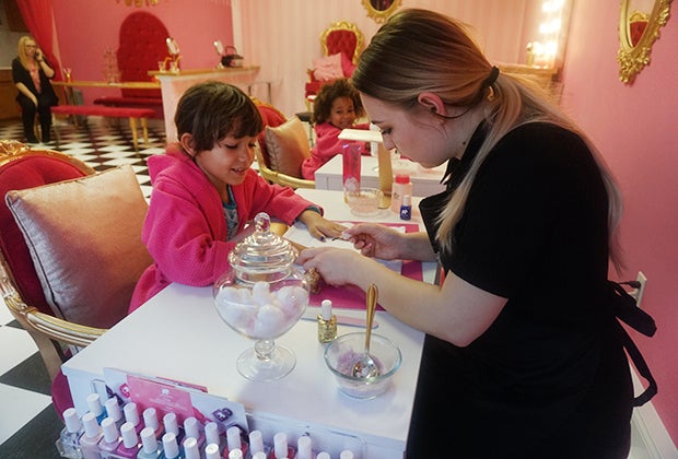 Located off the beaten path in a residential section of Greenpoint, visitors enter a cotton-candy pink wonderland fit for any birthday princess. When we arrived, Bychowska's niece, who serves as her pamperer-in-chief, whisked my girls (ages 3 and 7) away, first fitting them in snuggly pink robes, and then seating them at the pair of manicure stations as she set to work fancying up their nails.