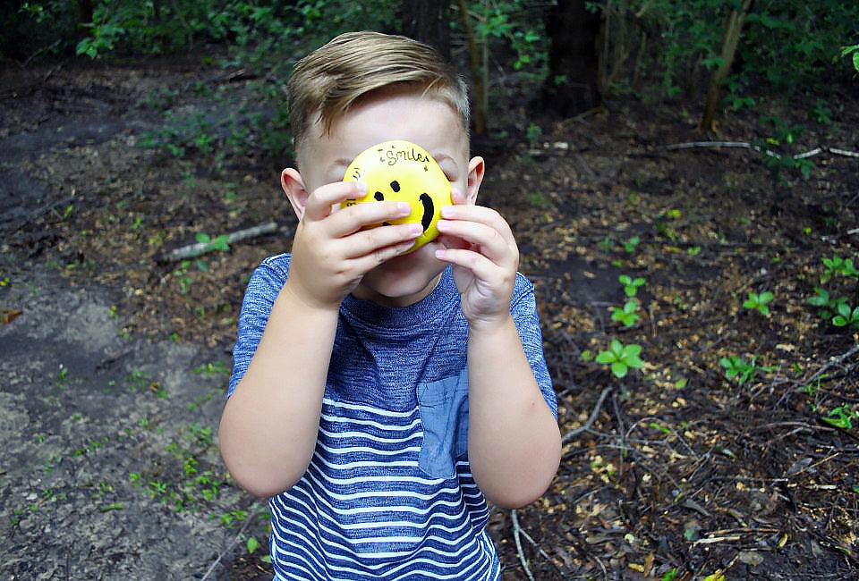 Because my boys are still rather young, we chose very simple designs. I let my 4-year-old cover an entire rock in yellow paint and once it dried, my 6-year-old painted a simple smiley face on it. Then, when the face dried, I wrote a couple of inspirational sayings with a paint pen. All three of us had a hand in making that one rock. It was a group effort that was such an easy concept yet turned out to be one of our absolute favorites despite its simplicity. They also got to go a little crazy on several rocks and painted a menagerie of squiggles and dots with seemingly no design in mind whatsoever.