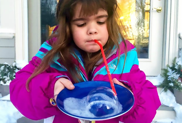 Another winter wonder that doesn’t require a large, designated space (or snow) is frozen bubbles. When the temperature falls below freezing (the colder the better), take a container of chilled soapy bubbles and blow through the wand. Try to catch one on the wand and in a few seconds to minutes, you’ll notice it start to freeze. Blow apart the pieces for a cool effect. You can also pour the solution into a bowl and blow bubbles through a straw to see them freeze all piled up.