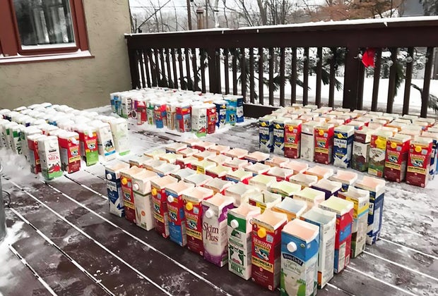 These cartons contain the frozen, colored bricks for the igloo. Photo by Kevin Riedy