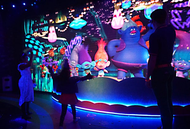 While everything from the makeover to the glitter chasing, music making, and high-fiving is tons of fun, you've now finally arrived at the big moment: Poppy's Best Day Ever Party. With technology from 3D Live, the party centers on a 10-by-25-foot 3D screen where Poppy, Branch, Guy Diamond, and many of their friends take turns rocking out to your favorite tunes from the Trolls soundtrack. A disco ball, flashing lights, and plenty of space to dance along make this a memorable (almost) finale.