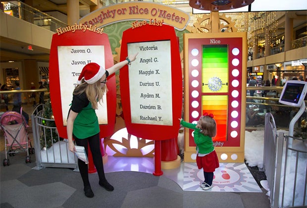 Top image: An elf shows a little girl she’s on the Nice List. Photo courtesy of Macerich.