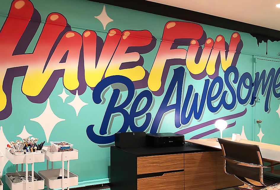 Playday's "Have Fun Be Awesome Wall" was personally drawn and painted by graphic and graffiti artist Queen Andrea. Photo courtesy of Playday