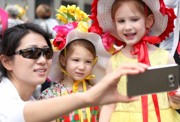 NYC families turned out in droves for the city's annual Easter Parade and Easter Bonnet Festival, from babies in strollers to groups of moms in long gloves and neon-hued hats. Bedecked in all manner of costume and creative bonnets, the Easter Sunday revelers mingled along Fifth Avenue in Midtown, gathering near St. Patrick's Cathedral across from Rockefeller Center.