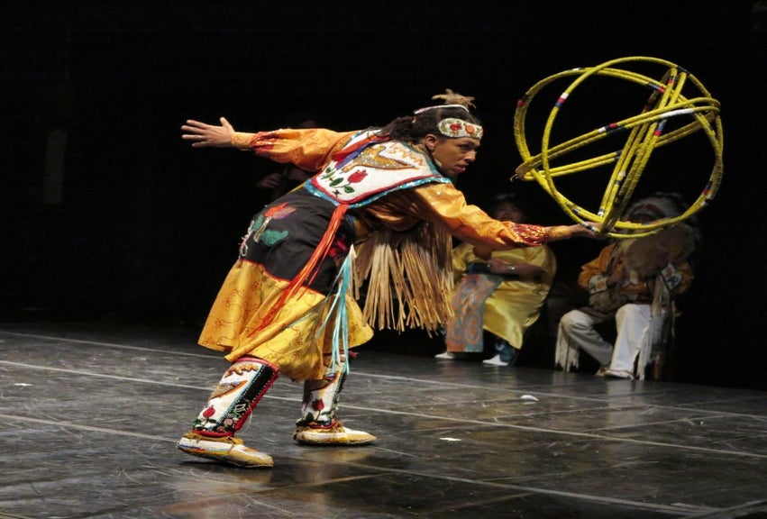 Highlights include storytelling by Muriel Miguel (San Blas Kuna/Rappahannock), founder of Spiderwoman Theater; the Hoop Dance set to guitar and flute music performed on alternating dates by Marie Ponce (Cherokee and Taino) and Michael Taylor (Choctaw); a Deer Dance (from the Yaqui Tribes of Southern Arizona) with Gabriel Perez (Mayan) and Carlos Ponce (Mayan), and various ensemble dances: a Grass Dance and Jingle Dress Dance (from the Northern Plains people), a Shawl Dance (from the Oklahoma tribes), a Rabbit Dance (from the Great Plains people) and a Smoke Dance (from the Iroquois). As the audience enters the theater, they are serenaded by the Heyna Second Son Singers (various tribes).