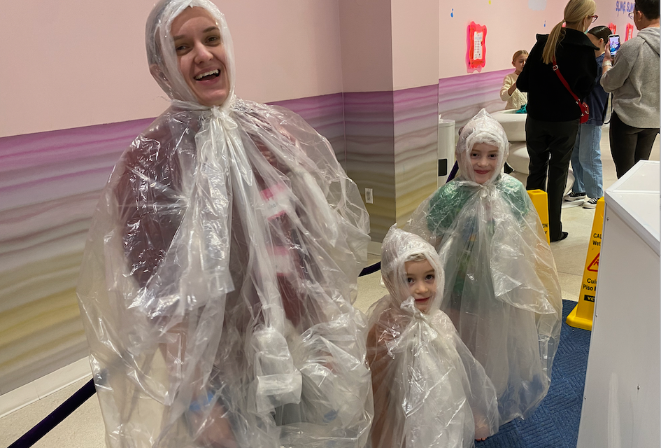 The enhanced experience includes the opportunity to suit up in a poncho and get slimed! Activities included in the regular priced ticket include trying a huge slime slingshot and walking barefoot over slime.