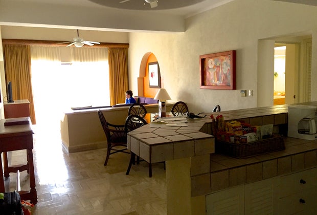 What makes Velas Vallarta particularly great for families is the spacious all suite room configurations. Our three bedroom suite offered four queen bed plus two bathrooms, a full kitchen, dining area and a living room with two sleeping couches–perfect for a large family, with lots of privacy. Fridges are stocked with beverages and beers. A mini bar offers snack foods, microwavable popcorn and hot and cold cereals, all re-stocked daily. Room service is included in the all-inclusive plan, a rare treat, so breakfast in bed or a late snack can be had at the press of a button. Or enjoy your breakfast from your room's ocean view balcony.