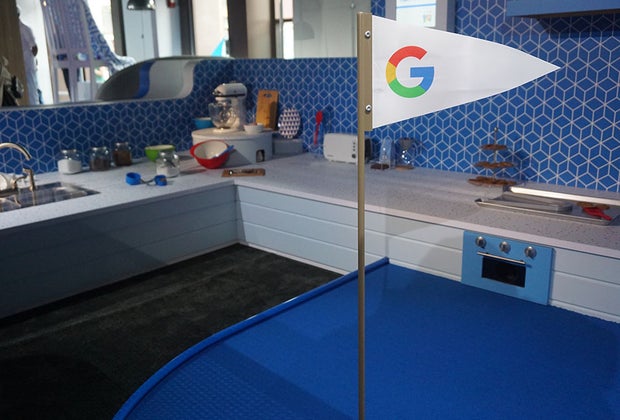 Each hole on the course is modeled after a room of your home and aims to teach you how the Google products can simplify everyday tasks. You might putt your way through a children's bedroom and learn that you can broadcast simple announcements like asking Google to let your family know its dinnertime by annoucing it to all your interconnected Google speakers, or greet Google with a "good morning," and await a personalized rundown of the days weather and news. Other holes in the course demonstrate how the Google products can help you in the kitchen, by reading you a step-by-step recipe and keeping a timer so your cookies don't burn, to turning on connected appliances like the TV, surveillance cameras, and a home fan.